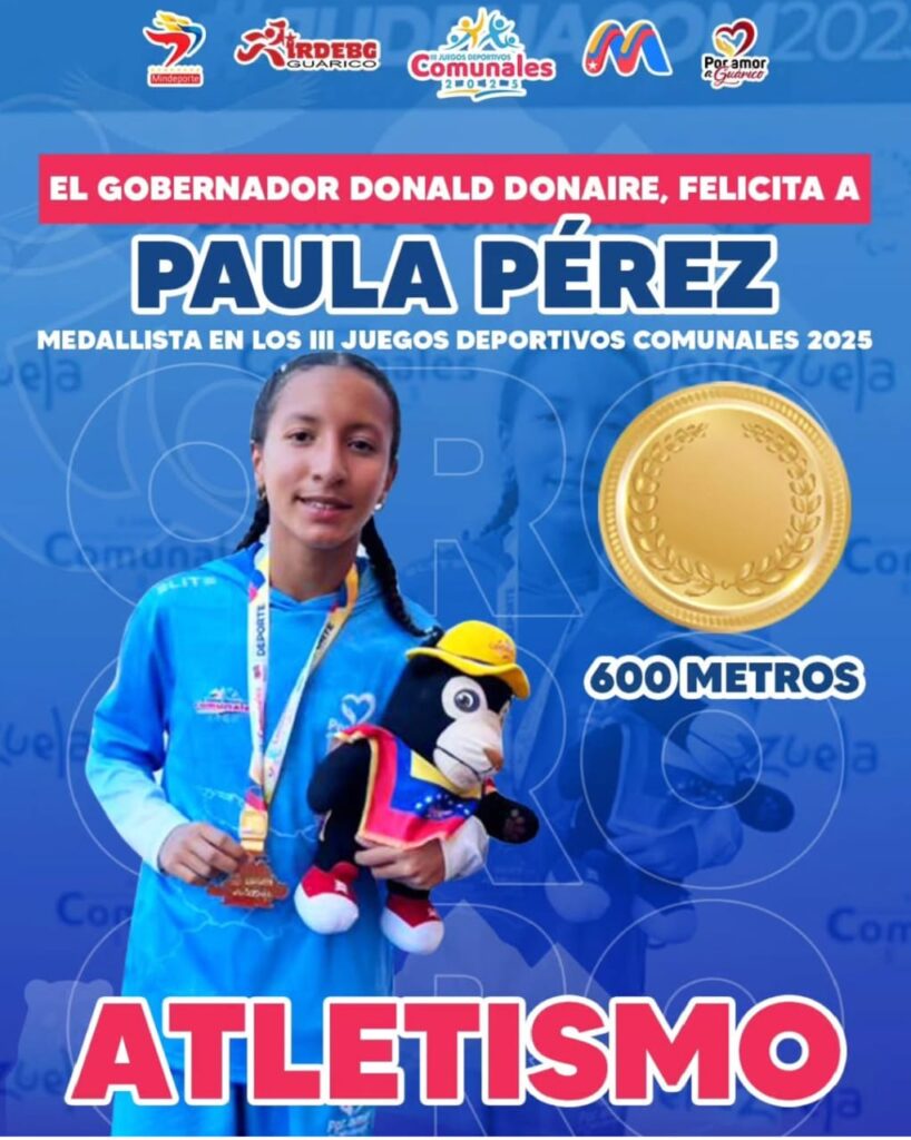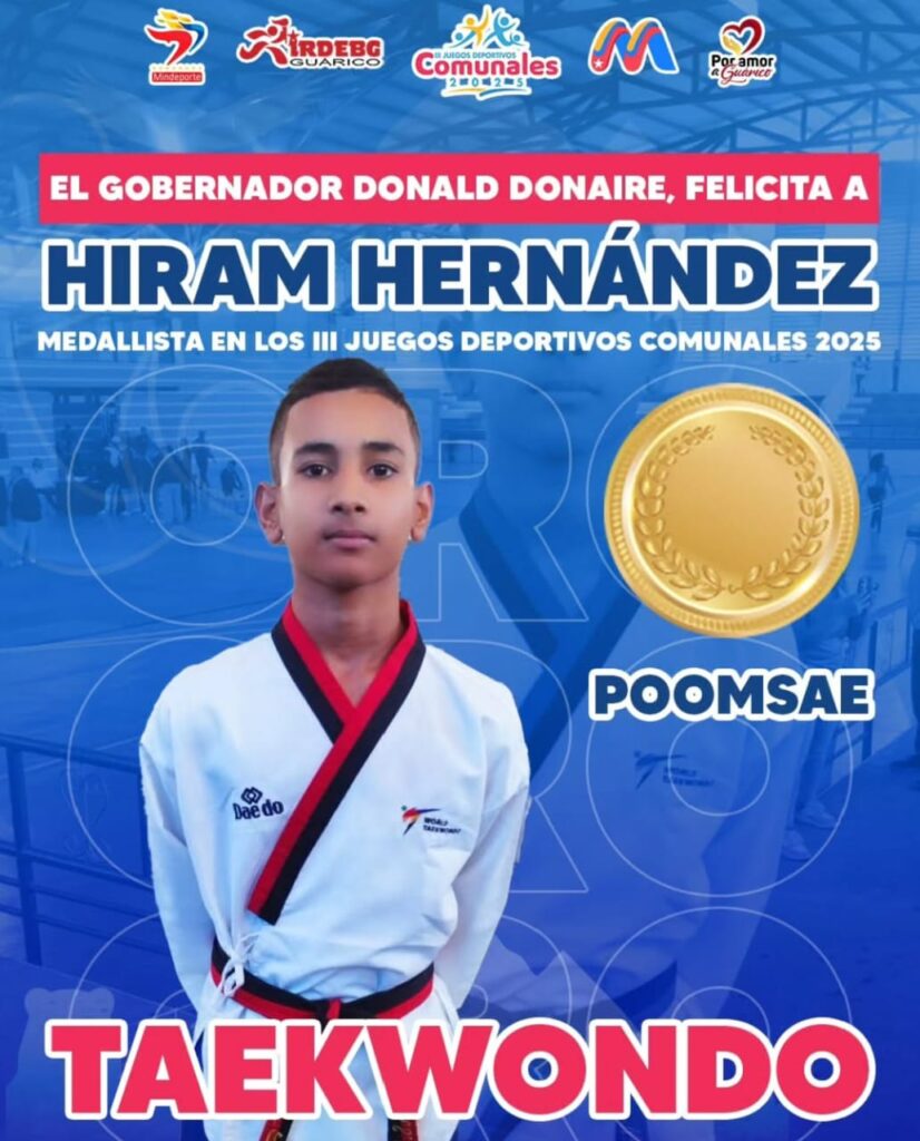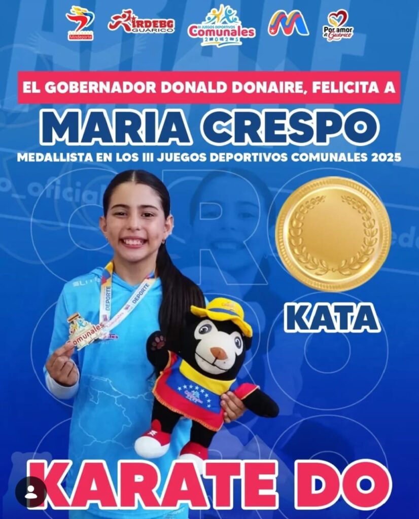 San Juan de los Morros, 17 de diciembre 2025.- La delegación del estado Guárico culminó su participación en los III Juegos Nacionales Deportivos Comunales 2025, logrando ubicar a la entidad en el puesto 22 del medallero nacional. La hazaña, compuesta por 3 medallas de oro, 1 de plata y 3 de bronce, llegó de manos de jóvenes que hoy son héroes en sus comunidades. Resaltando a Paula Pérez, quien conquistó Oro en la disciplina de Atletismo, Hiram Hernández en la disciplina de Taekwondo, y María Crespo en Karate Do.