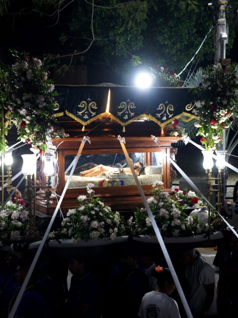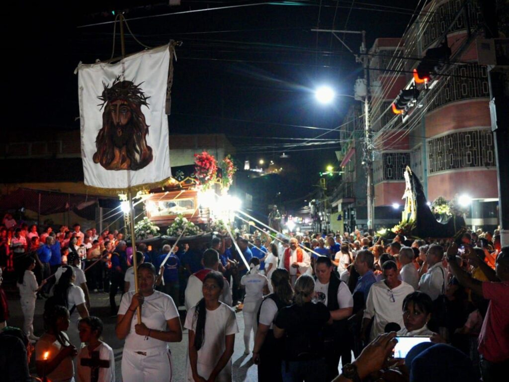 La procesión con la imagen del Santo Sepulcro, símbolo del cuerpo de Jesucristo tras su crucifixión, que avanzó lentamente por las principales calles de San Juan de los Morros. Junto a esta imagen, y con igual solemnidad, se encontraba la imagen de María la Dolorosa, representando el sufrimiento y la esperanza de la Virgen María en este momento crucial de la Pasión.
