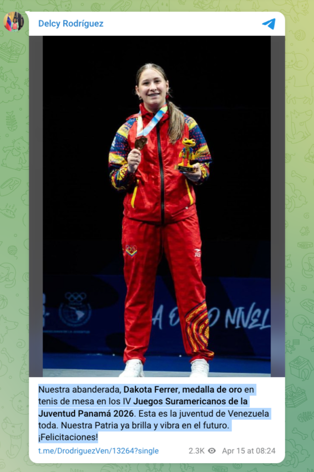 Caracas, 15 de Abril del 2026.- La presidenta encargada, Delcy Rodríguez, extendió este miércoles una calurosa felicitación a la atleta venezolana Dakota Ferrer, tras titularse campeona en la disciplina de tenis de mesa durante los IV Juegos Suramericanos de la Juventud Panamá 2026.